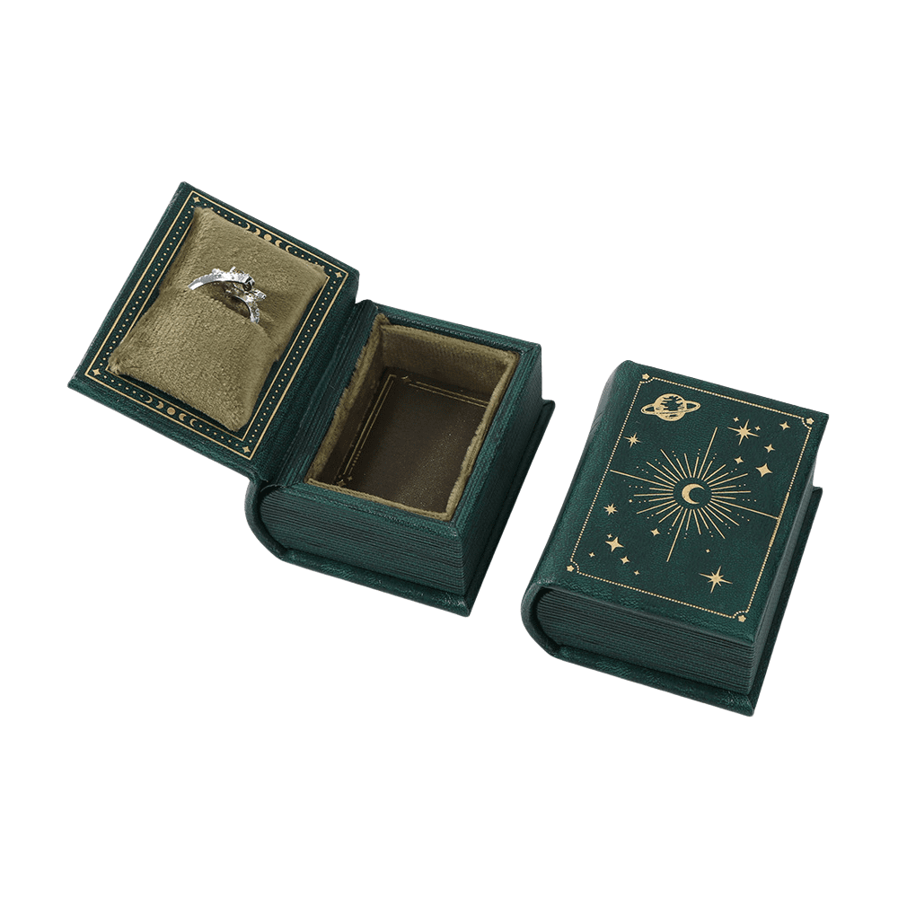 Book Shape Customised Wedding Ring Box is a playful box combined with sophisticated functionality. Star and moon designs in gold foil, the box is divine to the touch. Lined with soft velvet inside to protect your wedding or engagement ring, the box is now a lovely box for a love proposal or a creative gift box idea. With the simplicity of individualization by printing, the box is ideal for couples wishing to incorporate that additional element of uniqueness to make that wedding day shine just a bit brighter.