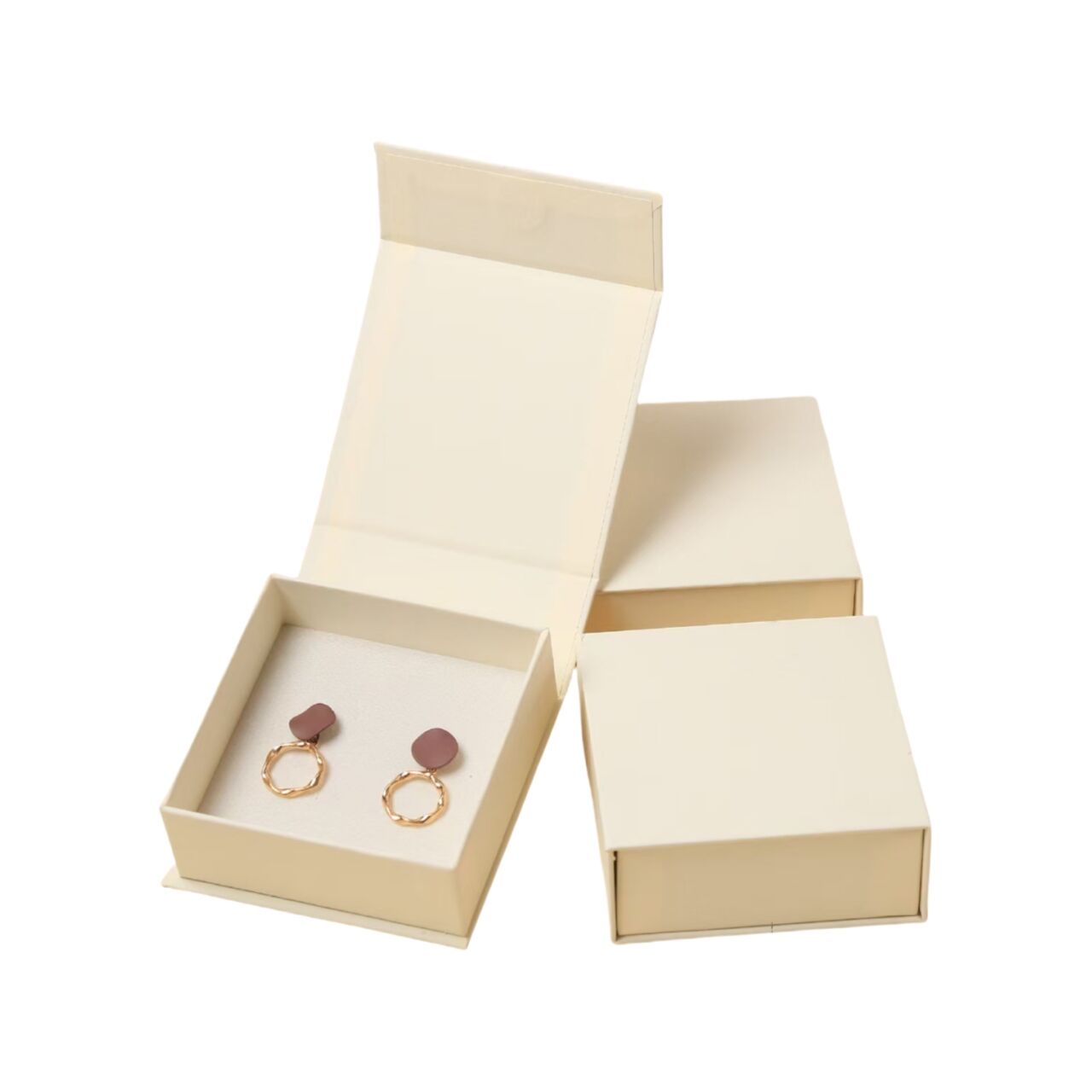 This box is a fashionable and budget-friendly packaging solution for jewelers. Made from tough chipboard material, the box combines strength with minimal weight and bulk. The magnetic closure lid adds a sense of luxury and enhances the unboxing experience. A velvet white interior pad holds a pair of earrings firmly in position without scratching them and presents them on a muted background. Both form and function will make the box perfect for packaging, gift presentation, or in-store showing. The plain matte finish presents a professional appearance without overwhelming the jewelry held within.