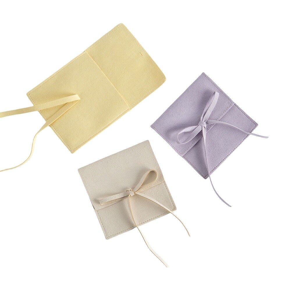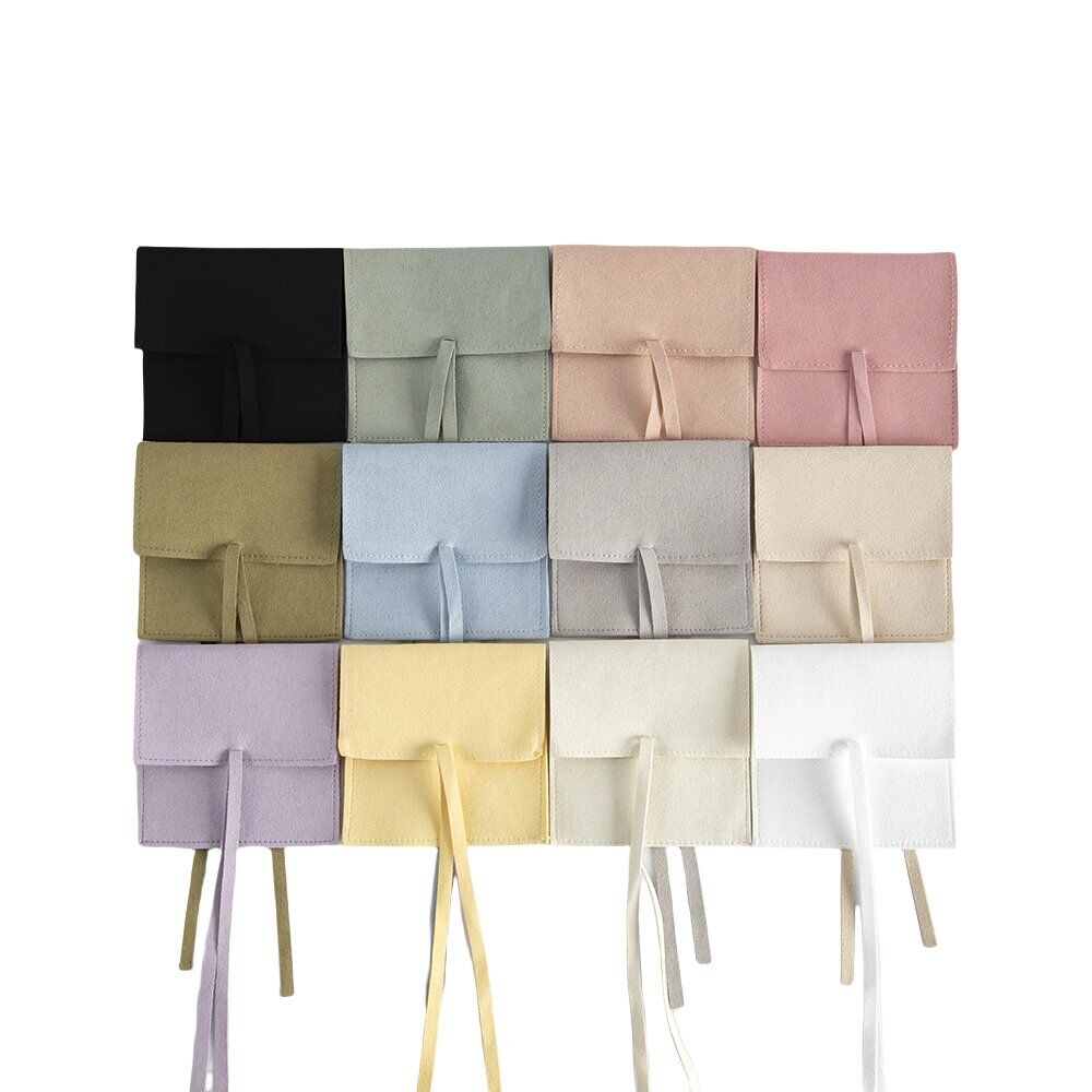 The jewelry bags are a fashionable and practical solution for jewelry brands in need of a greater level of presentation with a soft hand. Constructed of top-quality microfiber leather, the pouches have a soft, suede-textured finish that is gentle on the hand, wear-resistant, and vegan-friendly. The foldover top and coordinating bow tie ribbon closure serve not just for aesthetics but also create a secure closure for earrings, rings, and small pieces of jewelry. The pouches are available in a vast color range and are fully customizable in sizing to suit boutique packaging, retail selling, or promotional purposes. The exterior of the pouches also allows brands to add personalization with their own logo through silk screen printing, foil stamping, or debossing to create a uniform and professional look.