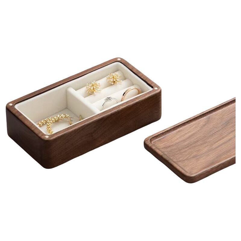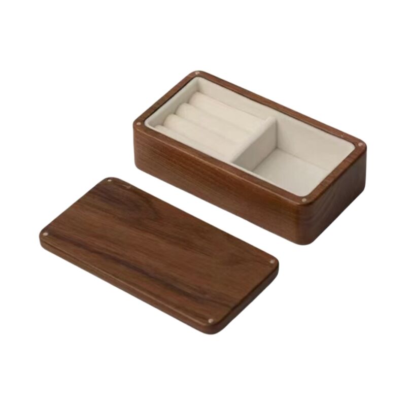 The box is a stylish yet space-saving way of displaying and storing beautiful earrings, rings, or individual jewelry sets. The box is solid wood and polished with polishing for a natural appearance and elegance. Velvet is added to line the inside to provide soft cushioning for delicate items, and a magnetic closure is added to lock the lid securely. With a handy slot and specialized ring rolls, this box is universal in fitting any piece of jewelry. Its compactness, portability for travel, and lid adjustment make this box the perfect solution for luxury retailers that require branding and accuracy. As a gift box, packing box, or display box, this jewelry box adds value and sophistication to any piece of jewelry presentation.