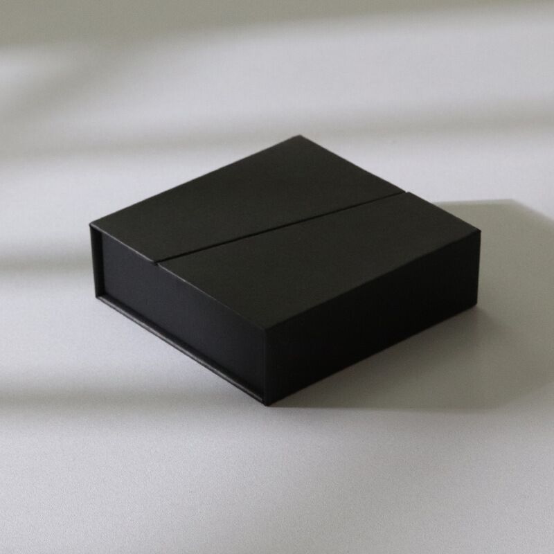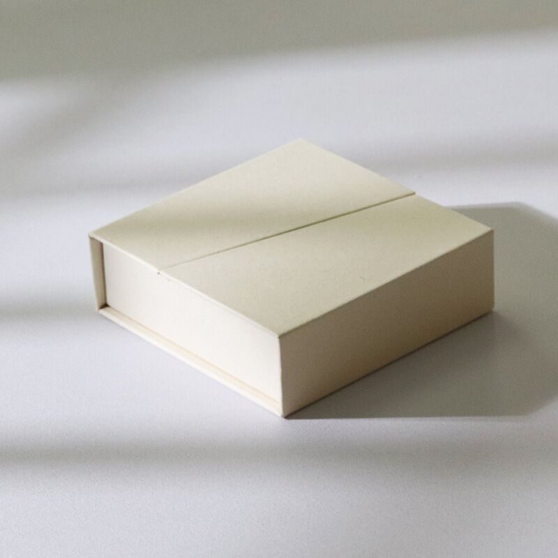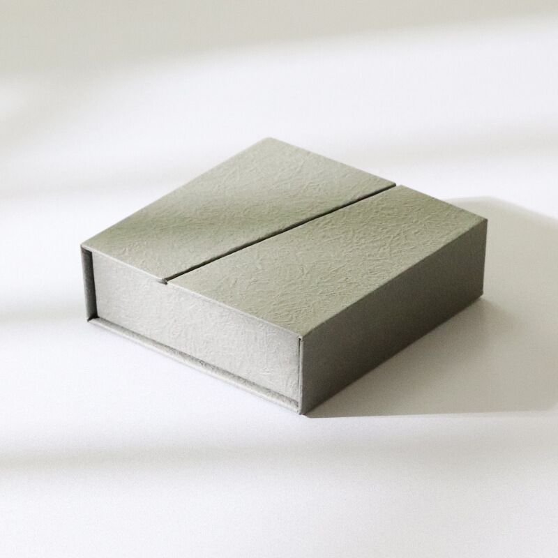 With a square design and distinct edges, this jewelry box exudes sophistication and a strong visual presence. The textured art paper finish enhances its luxurious feel.