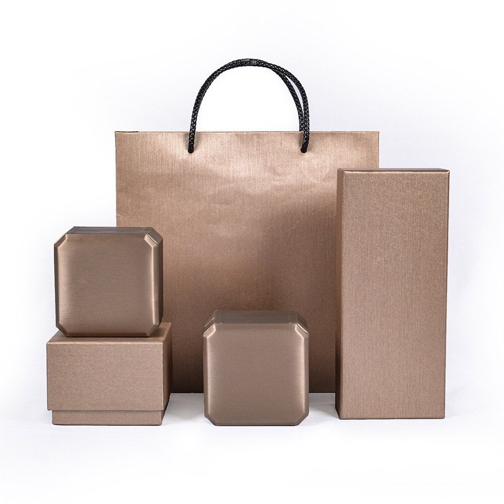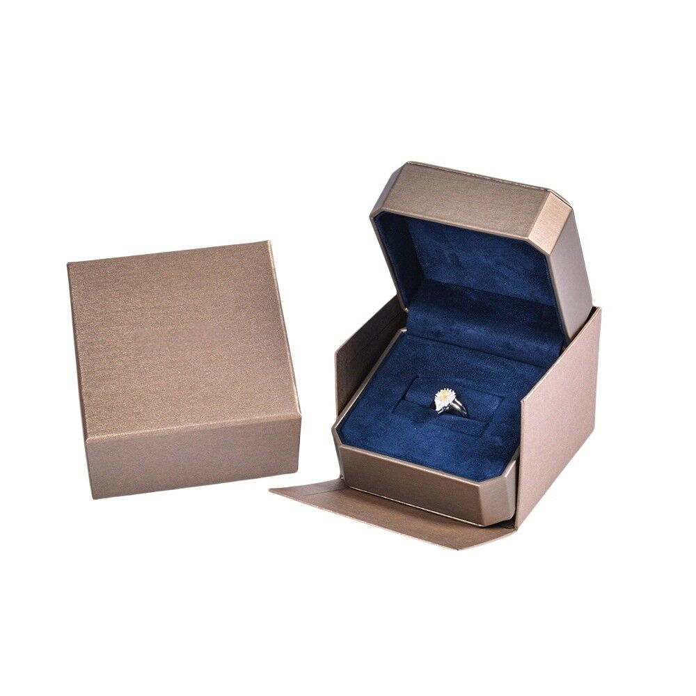 This high-end ring gift box serves to enhance presentation and protection for high-quality jewelry. Bronze outer and navy-blue velvet inner come together in an elegant boutique-style presentation box that makes an impression. With a sturdy HDPE inner frame construction and a high level of durability, and a soft-padded presentation surface for rings, the box presents a high-quality presentation solution. The 7.5 × 7.5 × 6 cm size is small but spacious enough to cradle various ring designs safely. Ideal as an anniversary present, boutique-store presentation, or promotion of an engagement ring, this box may be custom-printed with brand logos via silk screen, foil stamp, or deboss print for an on-brand look. Hing closure and a high-quality outer jacket complete the high-end design of this ring gift box as a high-quality packaging solution.