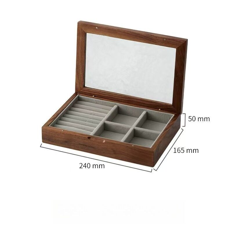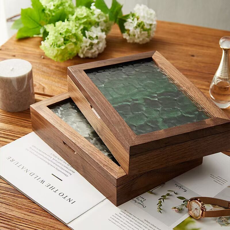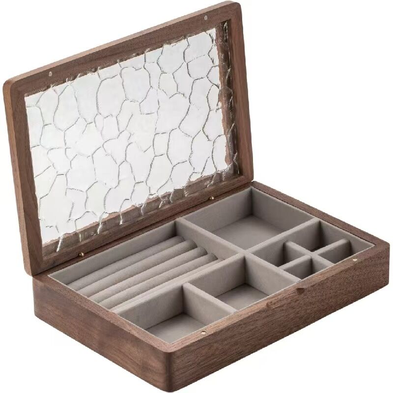 Store and organize your jewelry with elegance using this wooden jewelry box. Featuring a water ripple textured glass lid and multiple velvet-lined compartments, it’s perfect for rings, necklaces, and bracelets. Ideal for personal use or as a gift.