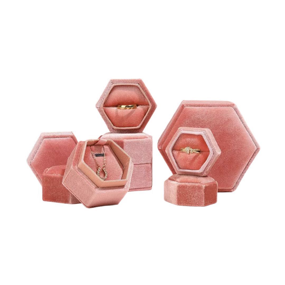 Our Hexagonal Velvet Jewelry Box, enveloped in luxurious velvet that boasts a strong, soft, and delicate texture.