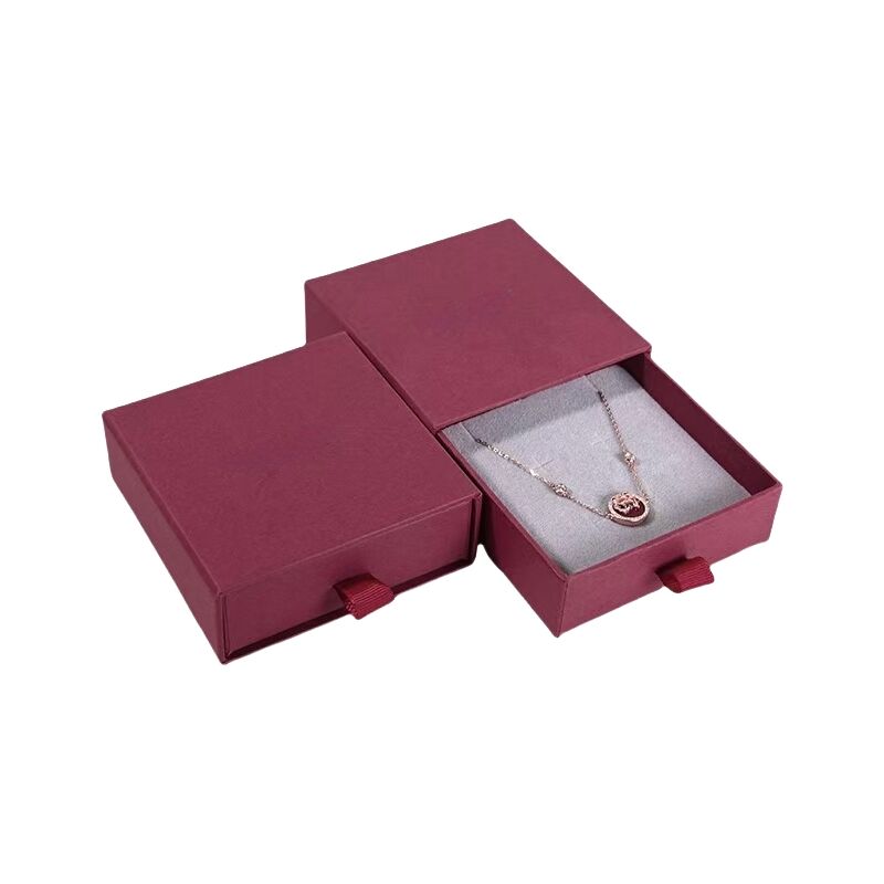 Elevate your necklace presentation with this high-end necklace gift box, designed with style and functionality in mind. Constructed from premium cardboard, it exudes sophistication and durability, with smooth slide-open action revealing the jewelry inside in a streamlined, clutter-free fashion. A ribbon pull tab delivers ease of access with a touch of refinement. The rich burgundy exterior contrasts beautifully with the plush grey velvet inside, the dramatic visual contrast placing your product in the spotlight. At 9 × 9 × 3.2 cm, it is perfectly sized for necklaces and pendant sets. With options for silk screen, foil stamping, and embossing logo finishes available, the box is the ideal vehicle for expressing brand personality in clean, high-end style.