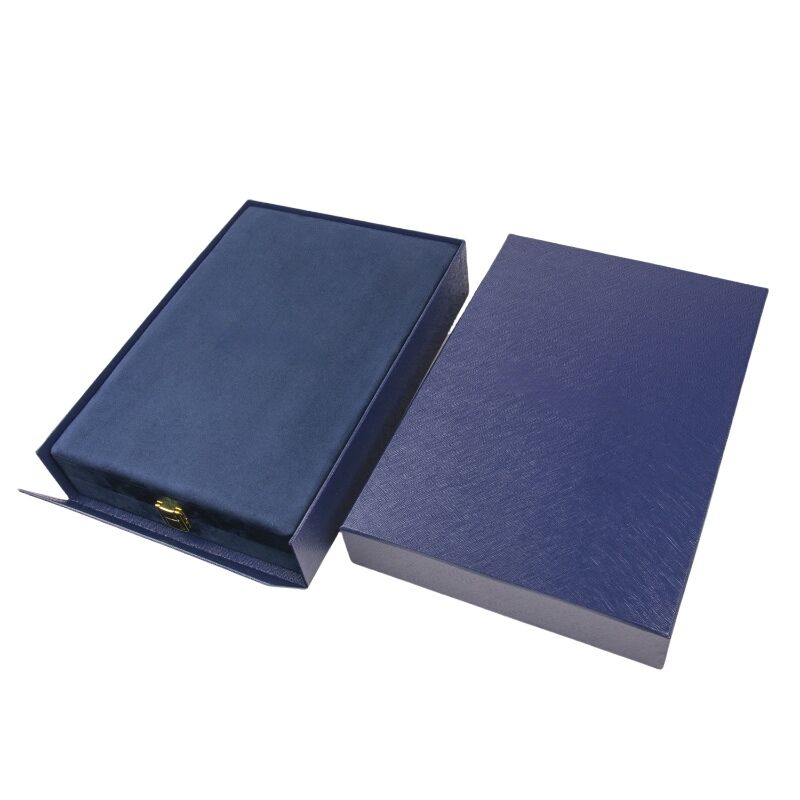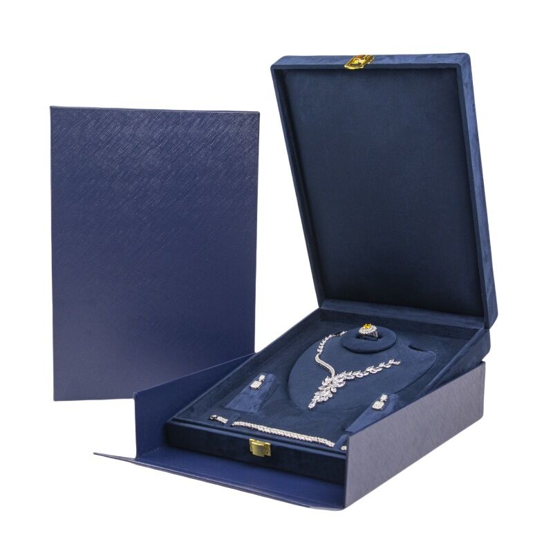 Sophisticated in every aspect, form and function, this jewelry set box is both usefully compartmented and visually striking in presentation. Bound in heavy-duty HDPE and covered in velvet navy blue, within is a complete set—ring, necklace, bracelet, and earrings—each in its own separate compartment. The inner insert is specially molded to seat each piece upright, and the outer case adds an extra level of protection and sophistication. A gold-plated clasp completes the look and raises the box’s high-end feel to the next level. Worth retail display or gift-giving for high-end presentation, the box makes an impression and can be completely customized with your logo through foil stamping, embossing, or silk screen printing.