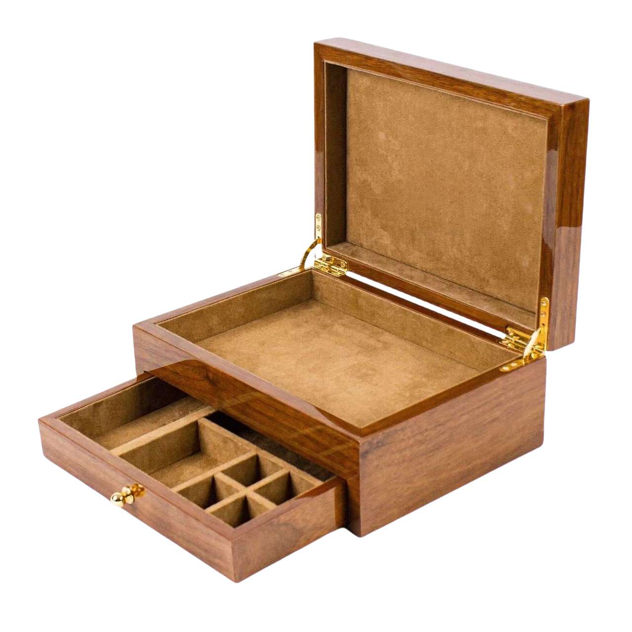 The pull-out drawer has specially sized compartments ideal for holding small jewelry items like earrings, pins, and rings. It serves to add function and organization, keeping the box useful for gifting as well as daily jewelry display.