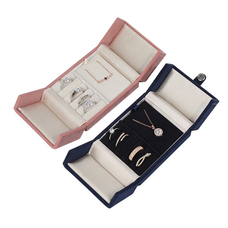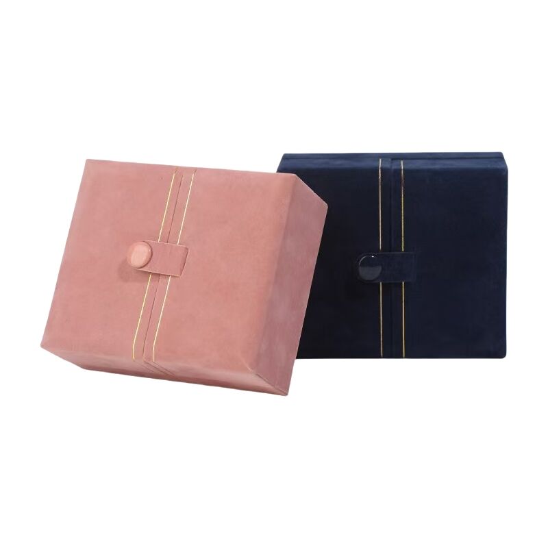 This petite velvet jewelry set box is made for style and function and is a sophisticated packaging solution for earrings, rings, and necklaces. Made of a soft-touch suede-like finish with subtle golden linework detail edges, the top of the box folds open to reveal a tidy interior with multiple areas of secure storage for types of jewelry. The fold-open top reveals two compartments, soft velvet-lined with necklace hooks, ring slots, and earring holders. The button closure adds a touch of security and aesthetics. Designed for professional jewelry packaging, the box is well-suited to include custom logo integration through hot stamping or debossing, allowing jewelers to promote their brand in style. The compact size is ideal for travel sets, promotion gift sets, or upscale packaging.