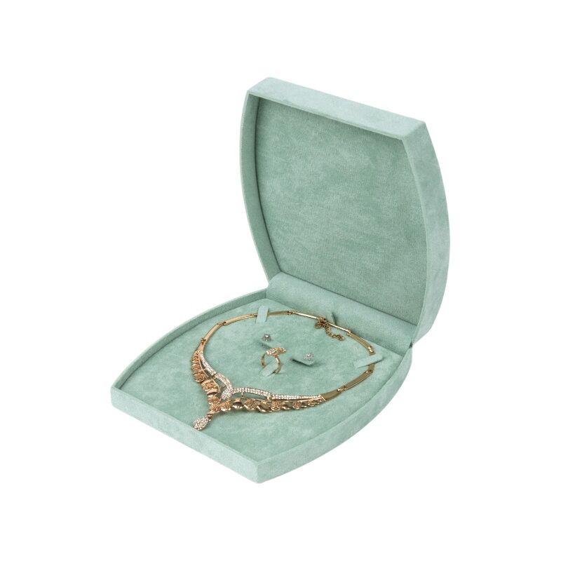 Designed to enhance the appeal of your high-end jewelry, this jewelry set box features a sculpted, soft-edge design and rich velvet wrap on the inside and outside. Built on a rugged HDPE core, the box offers consistent structural strength with a soft, plush touch suitable for high-end products. The uniform velvet wrap extends across all surfaces, creating a continuous, cushion-like cover that connotes subtle luxury. With the interior design exactly engineered to accommodate a necklace, earrings, and ring, this box is ideal for fine sets. Custom logo options—foil stamping or debossing—are available to meet brand visibility requirements in retail displays or gift scenarios. Designed for jewelers who need upscale presentation and protection for jewelry sets.